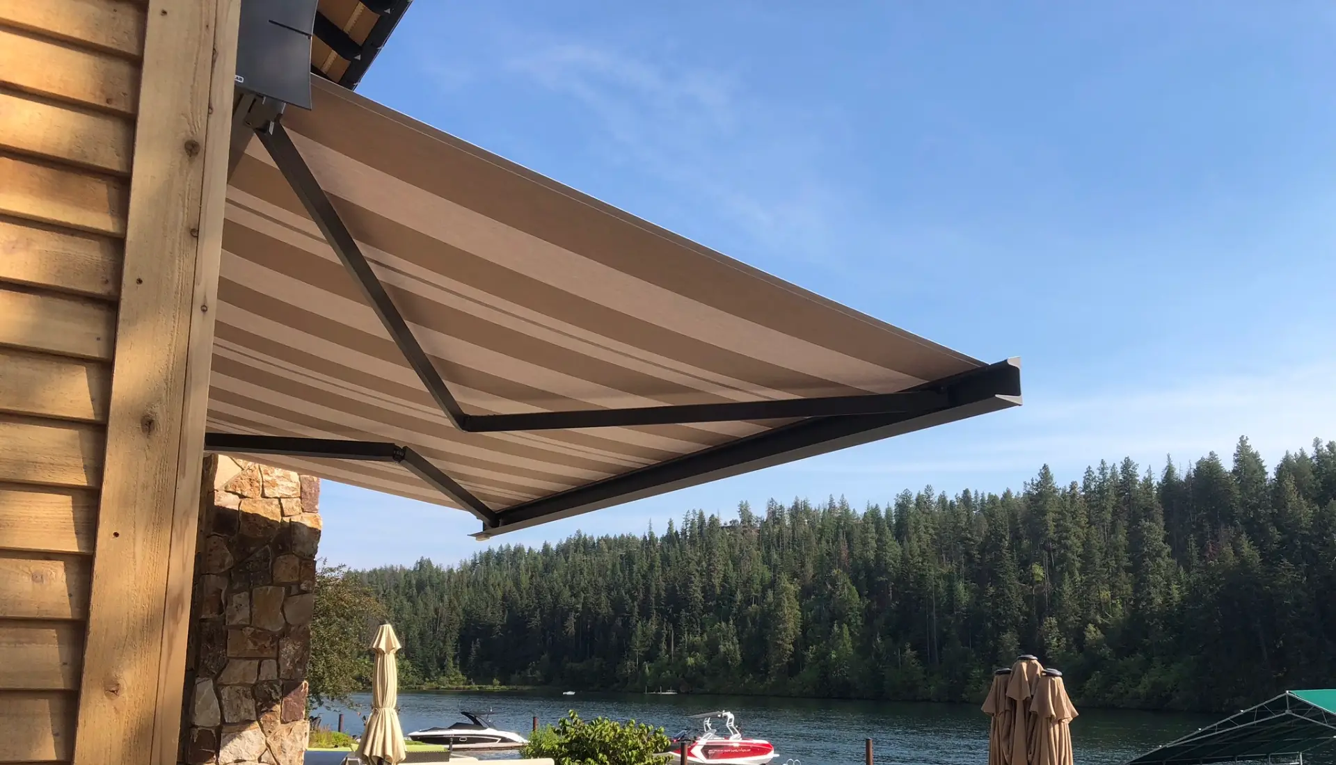 Outdoor spaces enhanced with custom shades and awnings that perfectly complement the home.